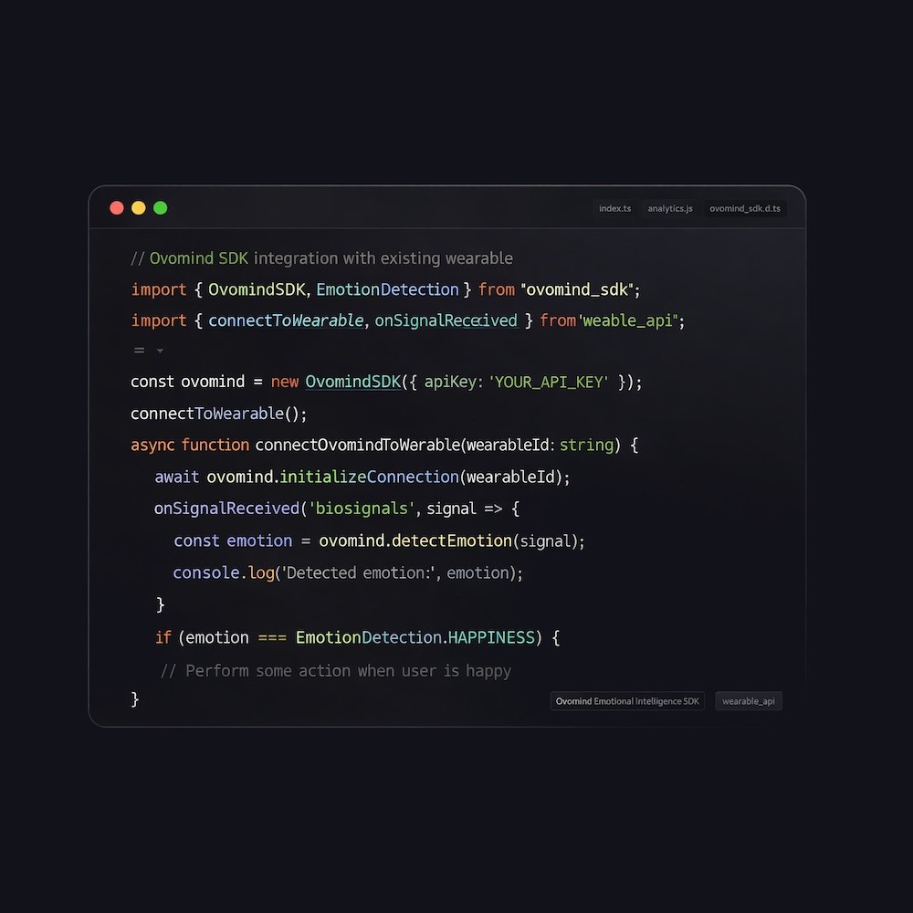 Ovomind’s emotional AI engine transforms raw biosignals into real-time emotional insights with sub-300 ms roundtrip latency. Built for products, devices, and experiences that need to understand how users feel, our output layer provides reliable, high-frequency emotional data designed for production environments. With Ovomind, emotional intelligence becomes a new input signal your systems can react to instantly.